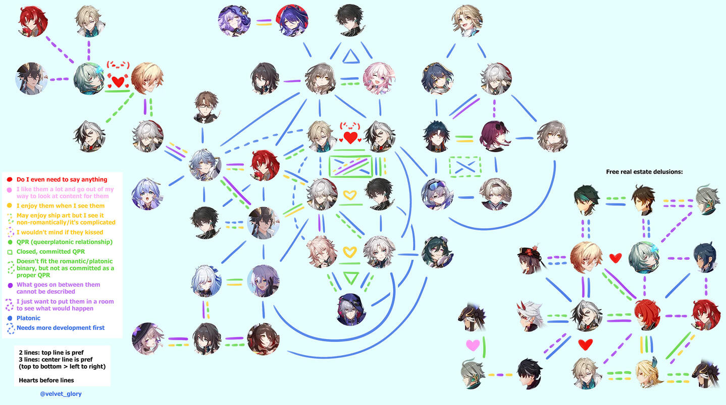 For the most part I don't mind other ships or can enjoy them an actually normal amount, but the ships above are the ones that had the biggest chokehold on my brain where I just couldn’t think of anything else for an extended period of time (many months or even years).Current fixation: mynaxa 99% of the timeI can't ship something unless I care about both characters as individuals first, but I do enjoy tossing my favs together and wondering what their relationship would be like (romantic, platonic, or otherwise.) So while I say I'm a monoshipper, it's with an asterisk. I just can't actively brainrot over ships that break up my OTPs, and I'm usually not fond of certain other ships involving them.Sheith will forever be dear to me cause I was insane for them and only them for three years straight. I don't think much about kagehina or makoharu anymore but they still deserve a mention since they really kickstarted my love for writing back in the day. For cyhaino I have a heavy QPR preference, and I'm also a big fan of QPR jinghengavenhill as well as Boothill/Aven/Anaxa/Mydei/JY/DH all in a QPR (see my ship chart/tree lol).
